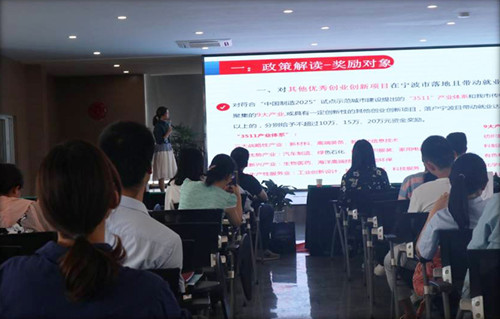 2018年5月24日在寧波市江北工業區管理委員會和寧波市江北區經濟和信息化局指導下,寧波物聯網學院協第三方管理咨詢機構(寧波高新區甬港現代創業服務有限公司和寧波易創智連創業服務有限公司),舉辦了公開課,現場為企業進行知識產權培訓、寧波優秀創業創新項目落地獎勵政策解讀及答疑交流。